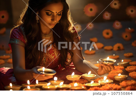Beautiful Hindu Indian woman lighting up candles at Diwali festival. Generative Ai.