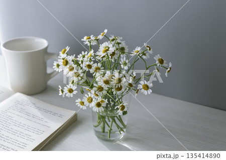 マトリカリアの花束と白いマグカップ 本とテーブルのある朝の静物 コピースペース