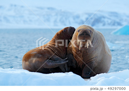 Young walrus with female. Winter Arctic landscape