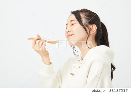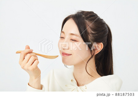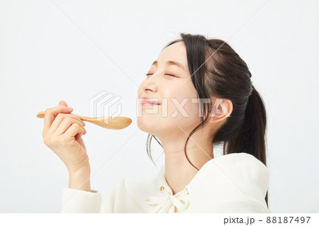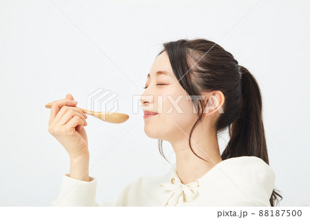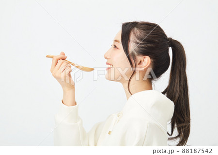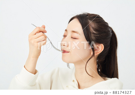 スプーンで食事をする女性