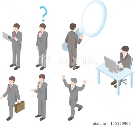 アイソメトリックなビジネスマンのイラストセット。悩む・検索・喜ぶなど様々なポーズの男性会社員