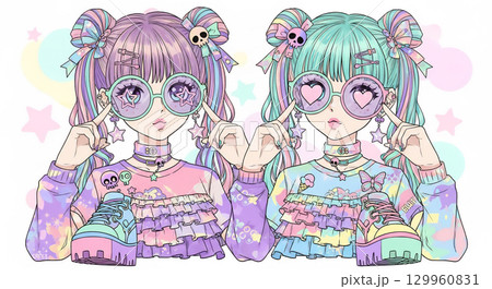 原宿系ファッションの双子風ガールズイラスト(ポップ&カラフル)