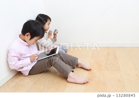 タブレット端末で遊ぶ幼い兄妹