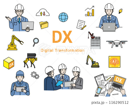 DX推進や取り組みをする建設業や製造業のイラストセット