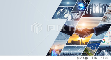 様々なビジネスシーンとテクノロジーイメージのコラージュビジュアル