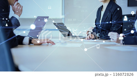 会議するビジネスパーソンのグループとデジタルデータのコンセプト