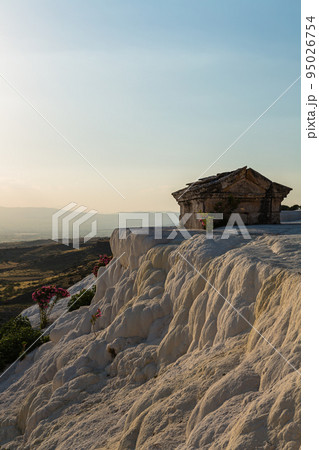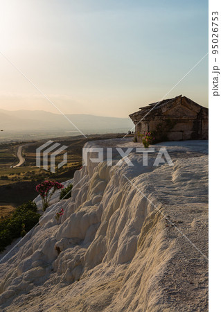 トルコ ヒエラポリス・パムッカレの白い鍾乳石に咲いた花と石灰棚の上に建つ小屋