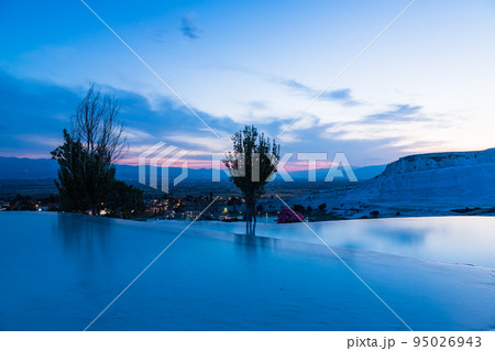 トルコ 夕暮れ時のヒエラポリス・パムッカレの鍾乳石と青い水面
