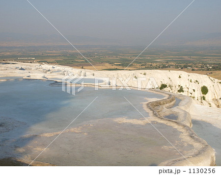 トルコ ヒエラポリス・パムッカレの白い石灰棚の上に建つ小屋と石灰華段丘から望む風景