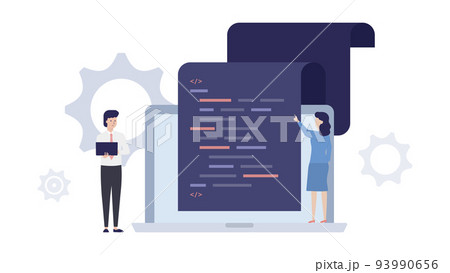 Male and female software testers. People testing application or website code. Programmers searching bugs. PC system correction. Computer programming and network coding. Vector concept