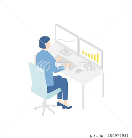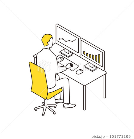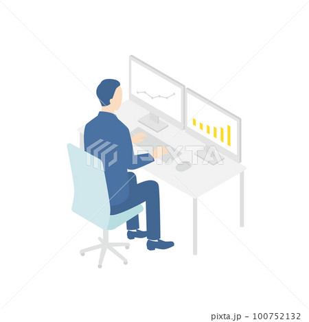 デュアルモニターでパソコン作業をする人 アイソメトリック