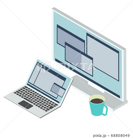 ノートPCと大画面ディスプレイのデュアルモニターのイラスト/白背景