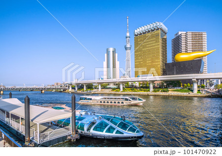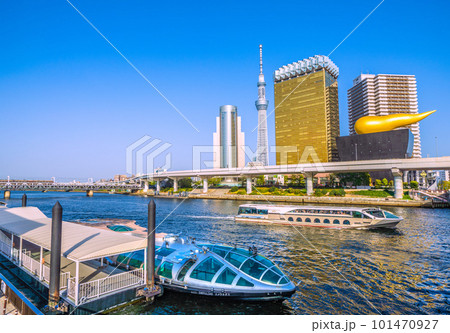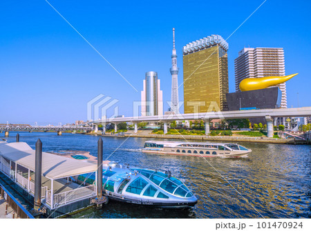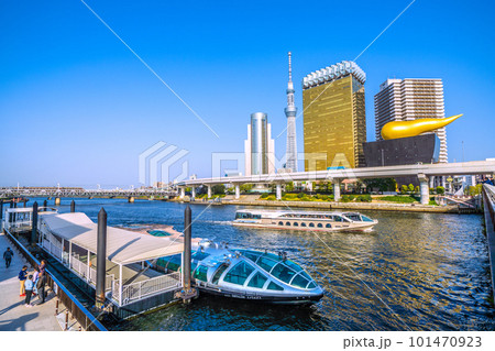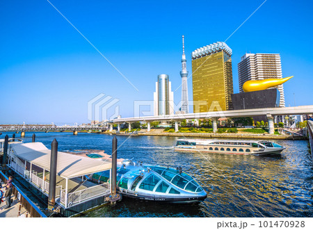 日本の東京都市景観 浅草水上バス乗船場で出航を待つエメラルダス。奥はジュビリー。左奥に珍スペーシア