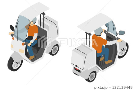 アイソメトリックイラスト:宅配バイクでデリバリーする男性セット