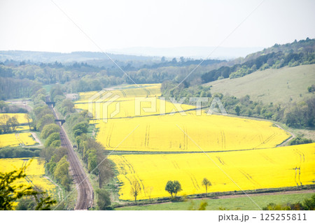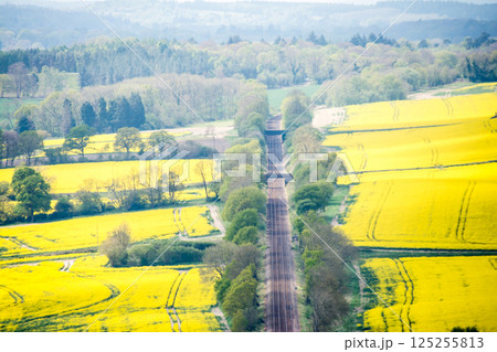一面に広がる菜の花畑に囲まれた列車の線路 ロンドン郊外のデンビーズ・ヒルサイドにて