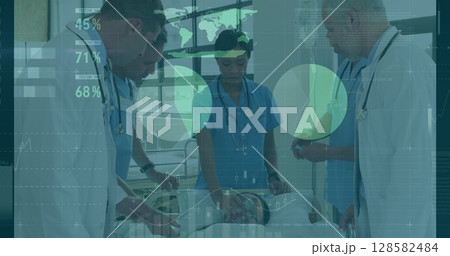 Image of icons connected with lines and graphs with profile icons and numbers over server room