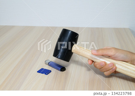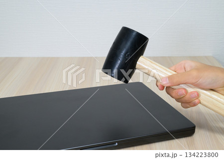 ノートパソコンに振り下ろされる金槌と記録媒体