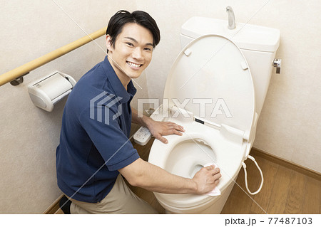 トイレの清掃をするハウスクリーニングの男性作業員の後ろ姿