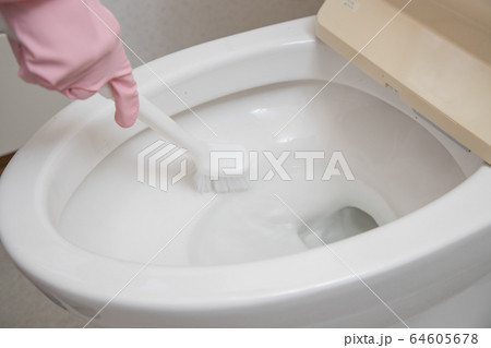 ピンクのブラシでトイレ掃除をするハウスクリーニングの女性作業員