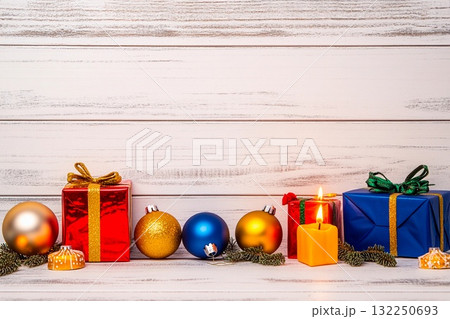 Happy New Year 2022. Christmas decorations, creative background with Christmas decorations, balls and fir branches with lights and snow, greeting cards, banner for display with place for text
