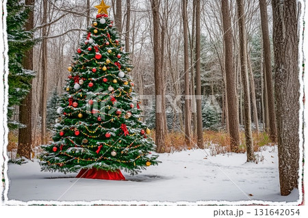Beautifully decorated Christmas tree stands proudly in snowy forest landscape during winter season