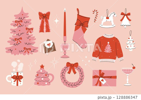 Pink Christmas set of cozy graphic elements. Vector graphics.