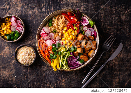 Vegetarian salad with fried tofu and fresh cucumbers in a bowl on the table