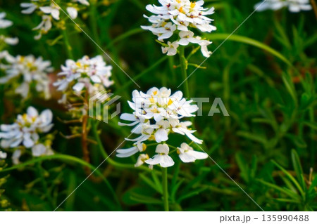 早春の庭に咲く白いイベリスの美しい花