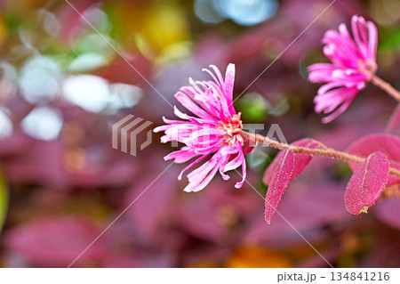 ベニバナトキワマンサクのひも状のピンク花をクローズアップ/埼玉県・4月
