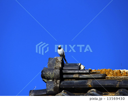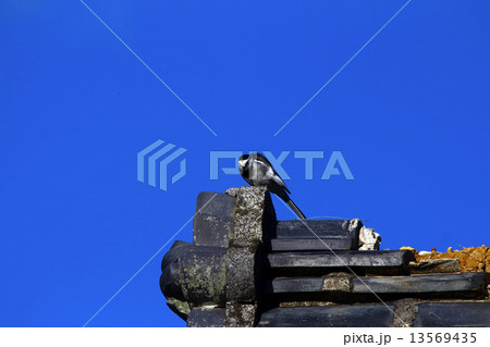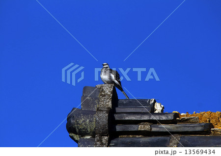 屋根の上に立つハクセキレイ(青空と白石嶺)