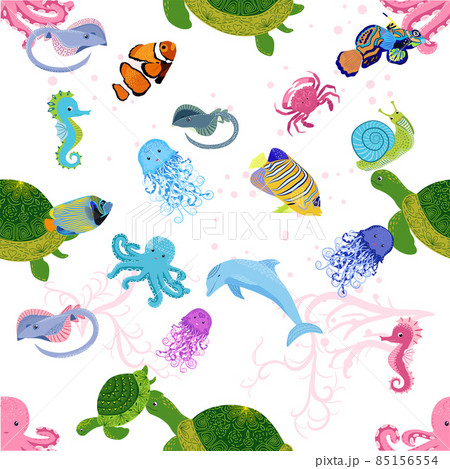 Marine life, fish, animals bright seamless pattern. sea travel, underwater diving animal tropical fish. Jellyfish, whale, shark, seahorse, clown fish, dolphin, turtle emperor fish octopus stingray