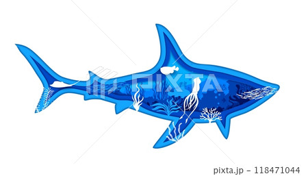 Shark silhouette with underwater landscape. Vector paper cut, shark-shaped, layered 3d frame with underwater scene features marine creatures surrounded by coral reefs and aquatic plants in the ocean