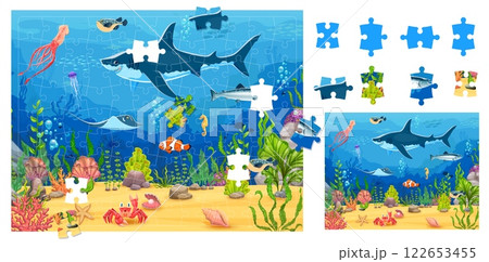 Underwater landscape, kids jigsaw puzzle logic game. Part connect vector puzzle, figure search riddle or game worksheet with corals, shark, squid, manta ray or stingray, clown fish cartoon sea animals