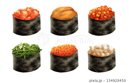 Premium realistic hand-drawn watercolor illustration set of Japanese Gunkan Maki or battleship sushi. Featuring salmon, uni or sea urchin, salmon roe, wakame, tobiko and scallop wrapped in seaweed.