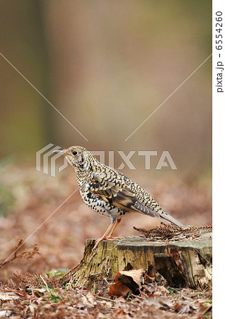 雑木林の落ち葉の中から餌を探す冬鳥の、トラツグミ