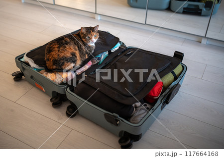 Fluffy tabby cat sitting inside rolling suitcase filled with owner clothes, stuff on apartment floor