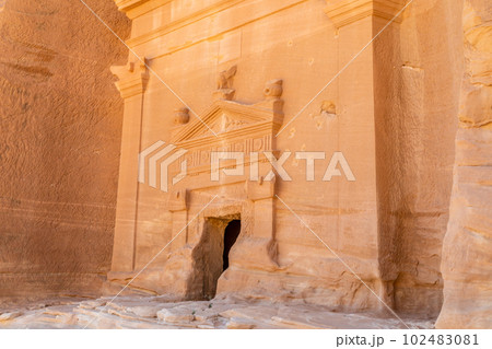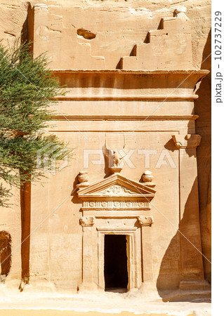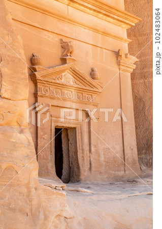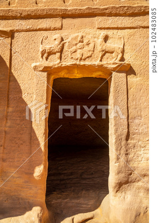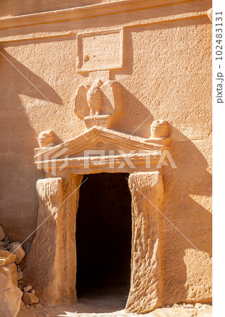 Carved ornamented entrance to the tomb at Jabal al banat complex, Hegra, Al Ula, Saudi Arabia