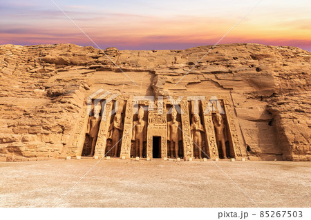 Abu Simbel Nefertari Temple, main view at sunset, Egypt