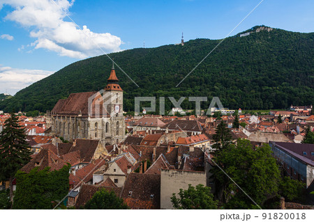 ルーマニア トランシルヴァニア地方のブラショフの黒の塔から見える旧市街の街並みと黒の教会とトゥンパ山