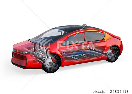 電気自動車のボディ、フレーム、トランスミッション、バッテリーなどの構造イメージ。