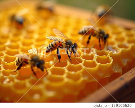 Four Honeybees Working on Golden Honeycomb Texture under Early Hive Sunlight