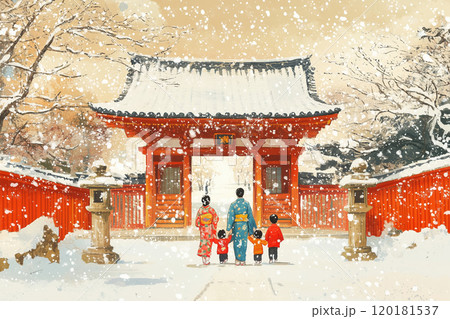 家族での初詣|日本の伝統を感じる穏やかな新年イラスト