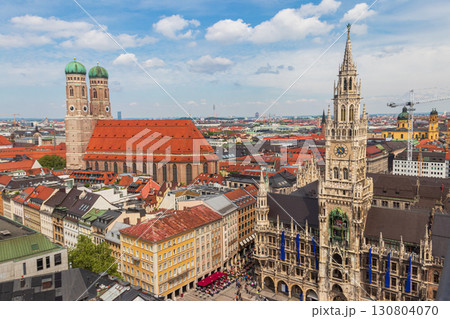 Aerial view of Marienplatz square with New Town Hall and Frauenkirche (Cathedral of Our Lady) in Munich, Germany