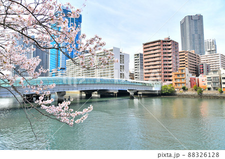 都市風景 運河沿い桜並木と高層ビル群 東京都中央区晴海