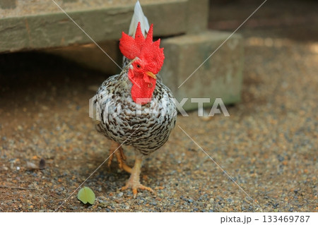 Beautiful breed rooster in the yard, a farm rooster in the yard, close up of a breed rooster in a yard
