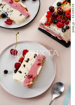 Vanilla and berries ice cream loaf cake, selective focus. Semifredo.