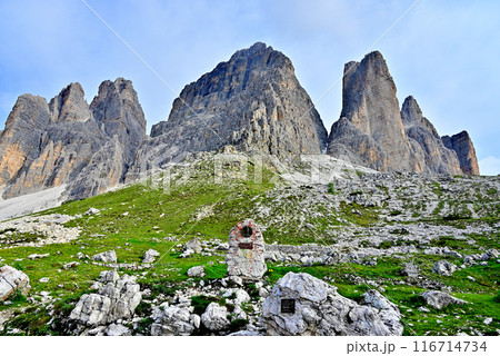 トレ・チーメ山塊と初登頂登山者のレリーフ