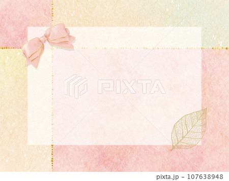 リボンと葉っぱをあしらったピンクと黄色の和紙に金のラインが可愛いフレーム背景イラスト