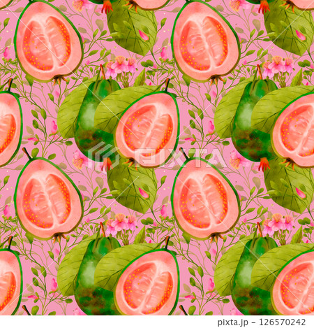 This is a vibrant and lively tropical pattern featuring guava fruits and lush leaves