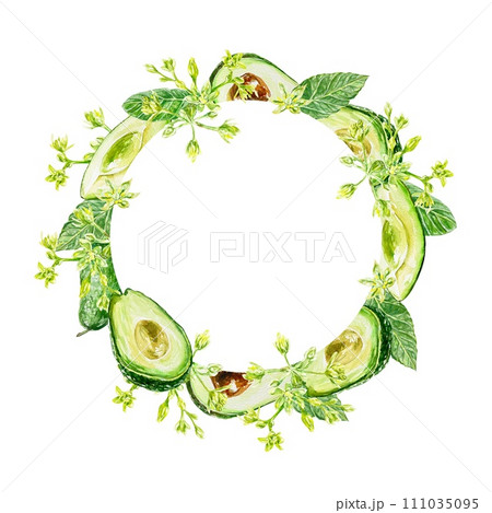 Avocado wreath. Avocado fruits, pieces, leaves, flowers. Watercolor illustration isolated on white background. Cards, invitations, labels, cosmetics.